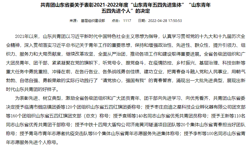 近日,共青团山东省委公布了《共青团山东省委关于表彰2021-2022年度“山东青年五四先进集体”“山东青年五四先进个人”的决定》 ,87978797威尼斯老品牌团委被授予“山东省五四红旗团委”荣誉称号,这是山东省共青团授予基层团组织的最高荣誉,是推进共青团改革向纵深、向基层延伸的重要载体。